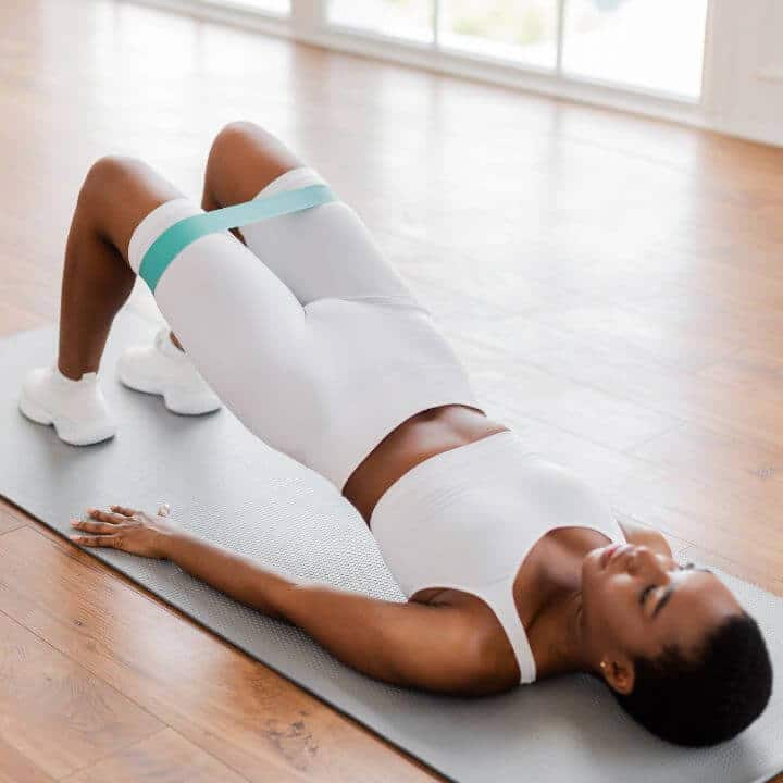 Añade la banda elástica a tu rutina para fortalecer brazos y piernas con movimientos como el puente con resistencia y el remo de espalda.